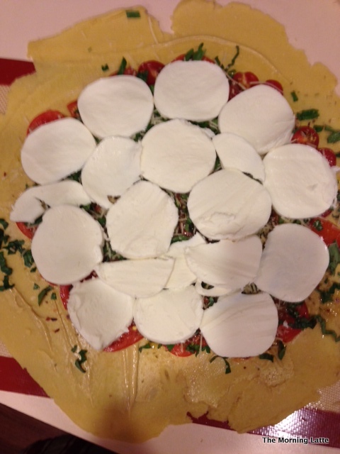 Slice tomatoes and arrange in a single layer in the center of crust. Scatter freshly minced garlic over tomatoes and drizzle with olive oil. Sprinkle with kosher salt, red pepper flakes and dried herbs.